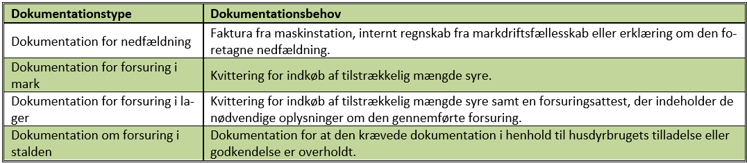 De specifikke krav til dokumentation for forsuring af gylle ved godkendte forsuringsteknikker fremgår i tabel 4 nedenfor.