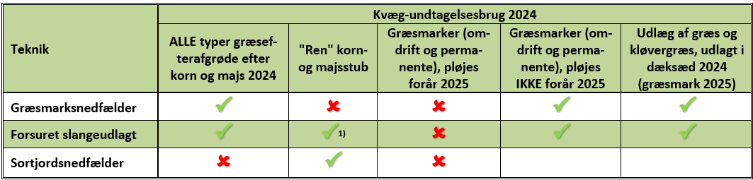 På bedrifter, som anvendte kvæg-undtagelsesreglerne i 2024, må græsudlæg og græsefterafgrøder ikke destrueres (ved jordbehandling eller nedvisning) før tidligst 1. marts, ligesom det i alle tilfælde gælder græsefterafgrøder i majs. Dog er der en generel lempelse fra reglerne, der omfatter udbringning af gylle i foråret på arealer med efterafgrøder og græsudlæg, hvor flydende husdyrgødning må udbringes med græsmarksnedfælder og som slangeudlagt forsuret gylle på alle brugstyper på ALLE efterafgrøder fra 1. februar; se tabel 2 og 3. Nedfældningen må ikke ødelægge græsudlægget eller græsefterafgrøden før tidligst 1. marts.
