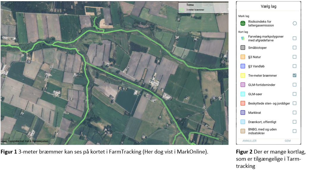 Det er lovpligtigt at have udyrkede 3-meter bræmmer langs alle vandløb, som er udpeget med krav om udyrkede bræmmer. Du kan som oftest se dine 3-meter bræmmer på dit markkort, hvis det er tilvalgt som tema ved udskrift af markkortet. Har du ikke disse kort, bør du kontakte din planterådgiver og få tilsendt et markkort, hvor de 3-meter bræmmer vises. Du kan også se dine 3-meter bræmmer i FarmTracking, og du kan også se mange flere kortlag, som §3-arealer og beskyttede jord- og stendiger.