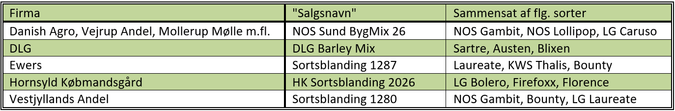 Tabel 1 Udbudte sortsblandinger i vårbyg 2026 (Kilde: Firmahjemmesider)