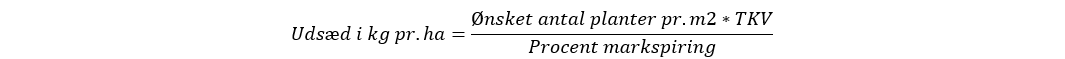 Ovenstående tabel er vejledende og gælder under optimale forhold på den valgte sådato. Ved dårligere forhold og senere sådato skal udsædsmængden øges. Beregningen baserer sig på den kendte formel for udregning af udsædsmængde, som også ses nedenfor.