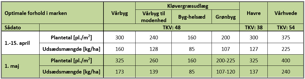 Tabel 1 Vejledende udsædsmængde ved etablering af vårsæd med og uden kløvergræsudlæg under de angivne forhold.
