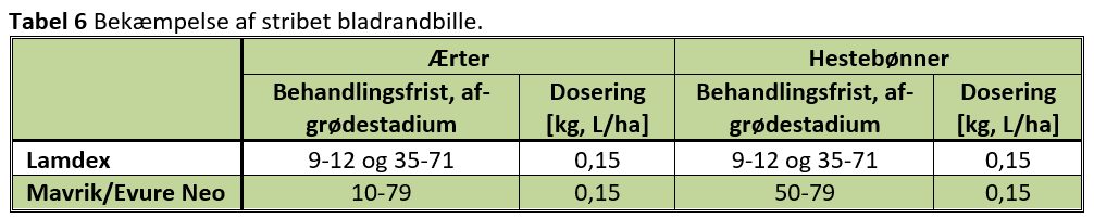 I rene ærter, byg/ært og hestebønner kan bladrandbillerne bekæmpes med pyrethroider. I øjeblikket er kun Lamdex og Mavrik/Evure Neo godkendt. Se forslag til dosis i tabellen herunder.