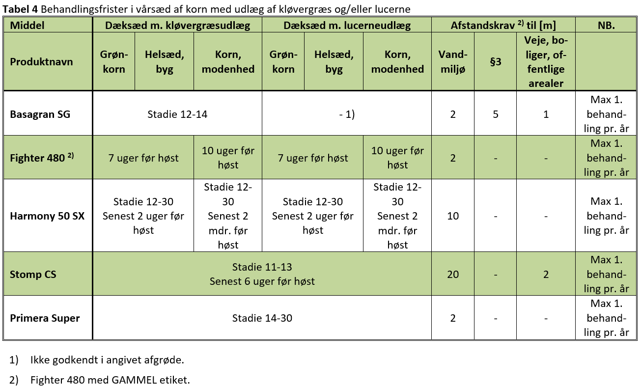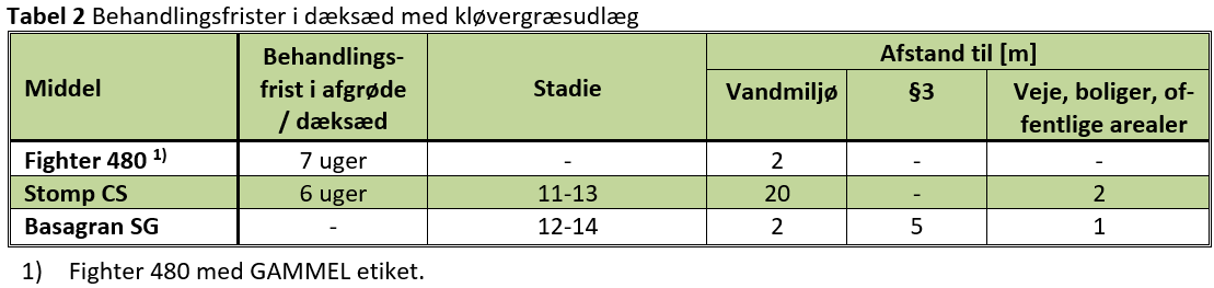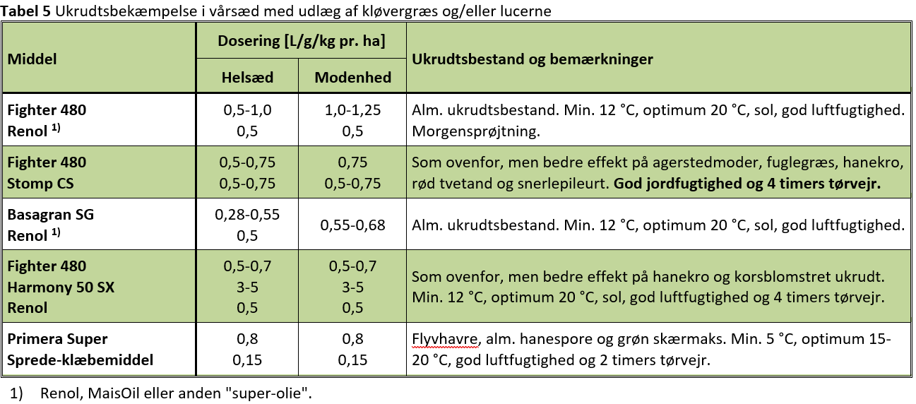 Fighter 480 / Basagran SG er de eneste midler, der er fuldt skånsomme over for kløveren, og midlerne kan anvendes uden hensyn til kløverens størrelse. Den bedste effekt opnås på små ukrudtsplanter under gode temperaturforhold. Tankblanding med Stomp CS kan give en effektforbedring på arter som fuglegræs, agerstedmoder og snerlepileurt, når der er god jordfugtighed, men pris/effekt-forholdet samt generelt ugunstige betingelser for jordmidler i foråret gør bred anvendelse uaktuel – i særdeleshed under tørre forhold. Hvis du vælger at bruge Stomp CS, skal frøene være dækket af jord for at undgå, at sprøjtningen påvirker udlægget. Se standardløsninger i tabel 5.