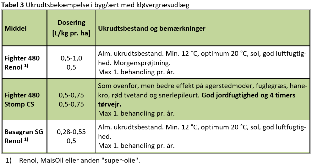 De eneste midler, der er fuldt skånsomme over for kløveren, er Fighter 480 og Basagran SG, som kan anvendes uden hensyn til kløverens størrelse. Den bedste effekt opnås på små ukrudtsplanter under gode temperaturforhold. Tankblanding med Stomp CS kan give en effektforbedring på arter som fuglegræs, agerstedmoder og snerlepileurt, når der er god jordfugtighed, men pris/effekt-forholdet samt generelt ugunstige betingelser for jordmidler i foråret gør bred anvendelse uaktuel – i særdeleshed under tørre forhold. Hvis du vælger at bruge Stomp CS, skal frøene være dækket af jord for at undgå, at sprøjtningen påvirker udlægget. Basagran SG indeholder samme aktivstof, som Fighter 480. Basagran SG indeholder næsten dobbelt så meget aktivstof pr. kg, som der er i en liter Fighter 480. Se standardløsninger i tabel 3, som er tilladt i byg/ært helsæd med kløvergræsudlæg.