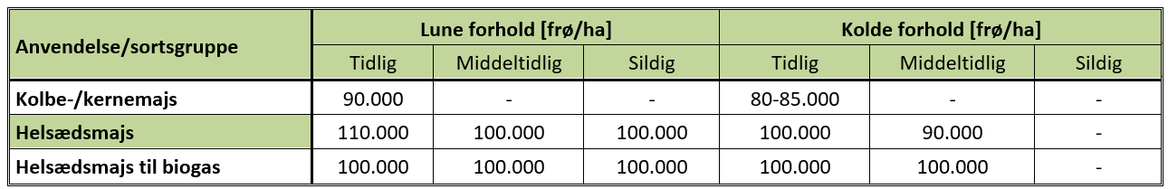 Tabel 1 Frøantal for helsæd-, kolbe- og kernemajs under lune og kolde forhold. (Kilde SEGES, tilpasset af SAGRO)