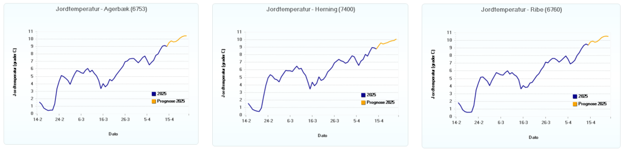 Figur 1 Aktuel jordtemperatur den 14. april og femdøgns-prognose for Agerbæk, Herning og Ribe (Kilde: SEGES)