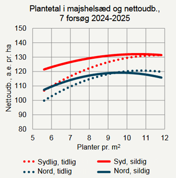 I både 2024 og 2025 har der været syv forsøg med plantetal i majs. Der er afprøvet fire forskellige sorter af forskellig grad af tidlighed, spændende fra en meget tidlig sort, Cito KWS, til en sildig sort, Benco. Alle sorter er afprøvet med fire forskellige plantetal i spændet fra ca. 60.000 planter pr. hektar til 115.000 planter pr. hektar. Sorterne er Cito KWS, Prospect, Function og Benco. Konklusionen fra forsøgene er som forventet, at det højeste plantetal også resulterer i det højeste udbytte, men også at kvaliteten er lidt dårligere, når plantetallet er højt. I praksis gælder det derfor som vanligt om at finde kompromisset mellem det højeste udbytte, den gode kvalitet og merprisen for de ekstra planter pr. hektar. I nedenstående figur ses udbyttekurven for de forskellige plantetal.