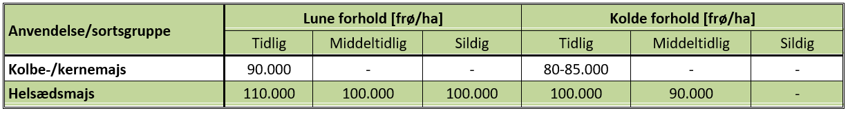Tabel 1 Frøantal for helsæd-, kolbe- og kernemajs under lune og kolde forhold. (Kilde SEGES, tilpasset af SAGRO)