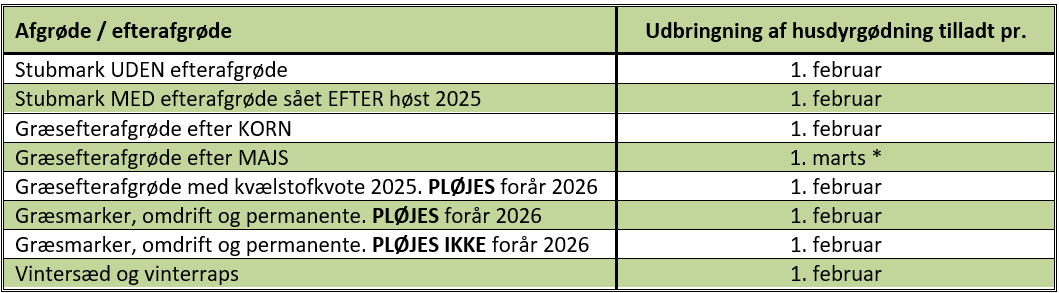Vær især opmærksom på, at pligtige-, husdyr- og målrettede efterafgrøder i majsstub IKKE må destrueres før 1. marts. Det betyder i praksis at sortjordsnedfældning af gylle og udbringning af fast husdyrgødning ikke er lovlig i februar måned.
