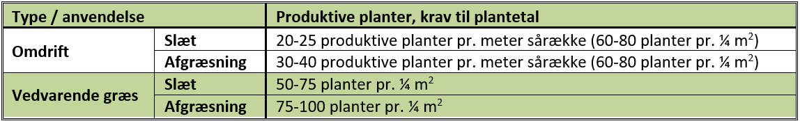 Kravene til plantetæthed i græsmarken er forskellige, alt efter om marken skal bruges til slæt eller afgræsning, og hvorvidt der er en bestand af hvidkløver eller ej. Der skal være tættest plantebestand, hvor der ikke findes hvidkløver i afgrøden.