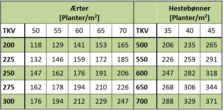 Tabel 4 Vejledende udsædsmængde i kg/ha for ærter og hestebønner