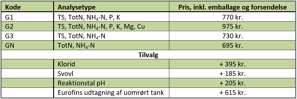 Det er professionelle prøveudtagere fra Eurofins, som udtager prøven. Bestilling sker stadigvæk igennem din planterådgiver, men få nu bestilt i god tid. Det koster et tillæg på 615 kr. pr. prøve at få udtaget prøverne fra uomrørte tanke. Se de øvrige priser og analysetyper i tabel 5.