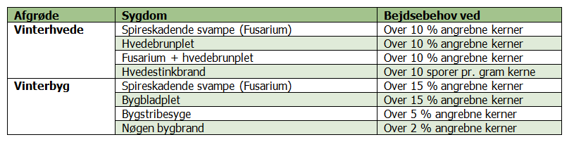 Tabel 1 Oversigt over hvornår der anbefales bejdsning ved forskellige udsædsbårne sygdomme i vinterhvede og vinterbyg.