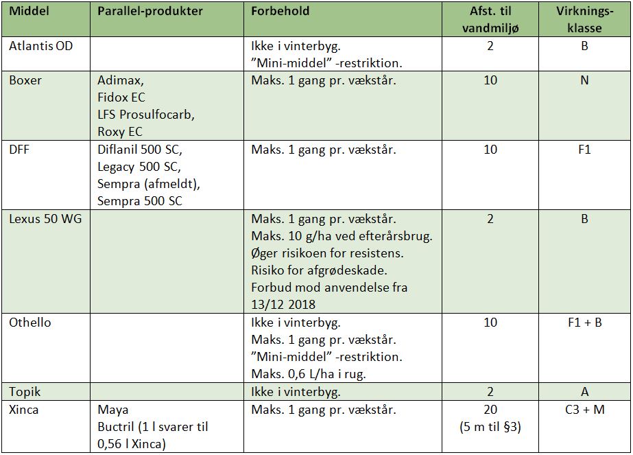 Resistens mod ALS-hæmmere, og så kaldet ”mini-midler”, er mest udbredt. Resistensudvikling forebygges ved at bruge forskellige virkemekanismer (se tabel 3). Boxer/DFF er de vigtigste resistensbrydere. I forhold til tokimbladede arter som kamille og fuglegræs kan Xinca bryde resistensudvikling mod Ally/Express-midler. Alternativt kan der bruges Mustang Forte, Zypar eller lignende i foråret.