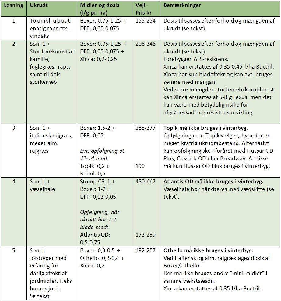 Tabel 1 Løsningsforslag til bekæmpelse af ukrudt i vintersæd. Bekæmpelsen har bedst effekt i kornets stadie 10-11 (når sprøjtesporene netop er synlige). Priser er hentet fra middeldatabasen.dk (kilde: Seges).