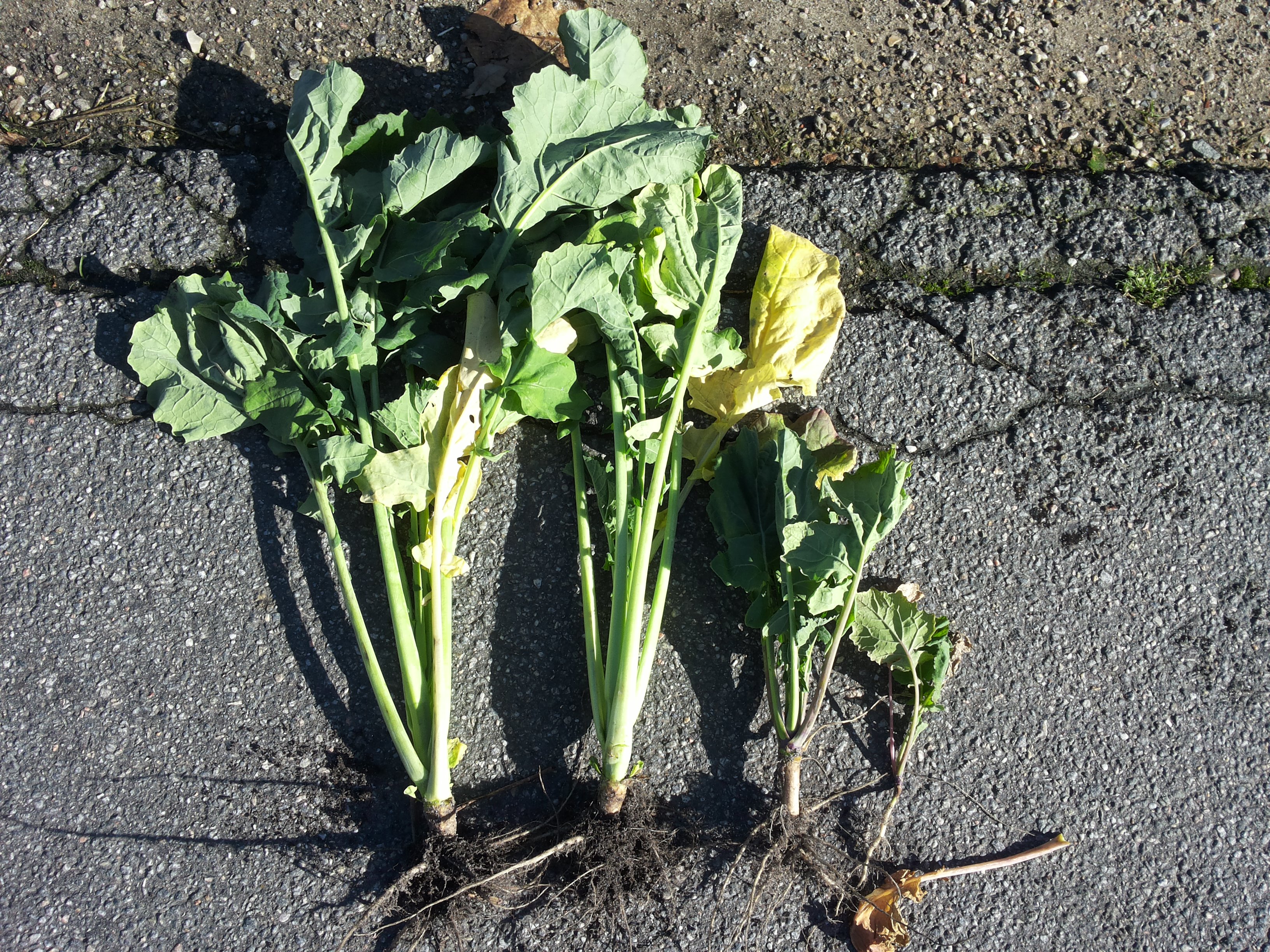 Billede 3 Vinterrapsplanter fra en mark med stor variation. De store planter strækker sig i vejret, og er udsatte for frostskader (Foto: Marie Uth, SAGRO).