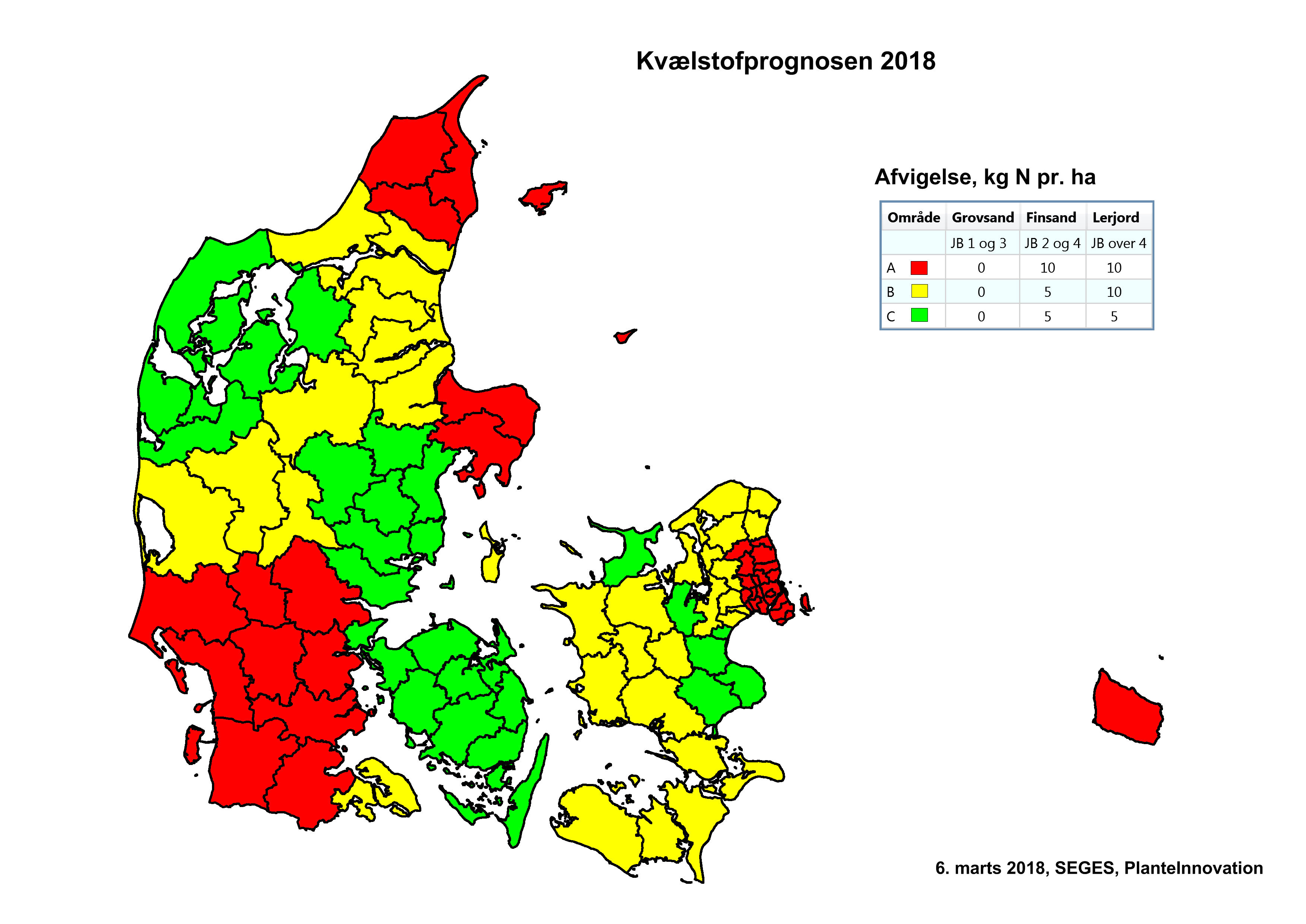 Kvælstofprognosen er nu offentliggjort. Som følge af de store nedbørsmængder, må der tilføres ekstra kvælstof på finsandet jord og lerjord. Størrelsen af den ekstra mængde kvælstof varierer i de forskellige egne af landet. Som det fremgår af kortet nedenfor, varierer N-mængden mellem område A, B g C. Du kan se, hvilke områder din kommune tilhører i kommunetabellen: