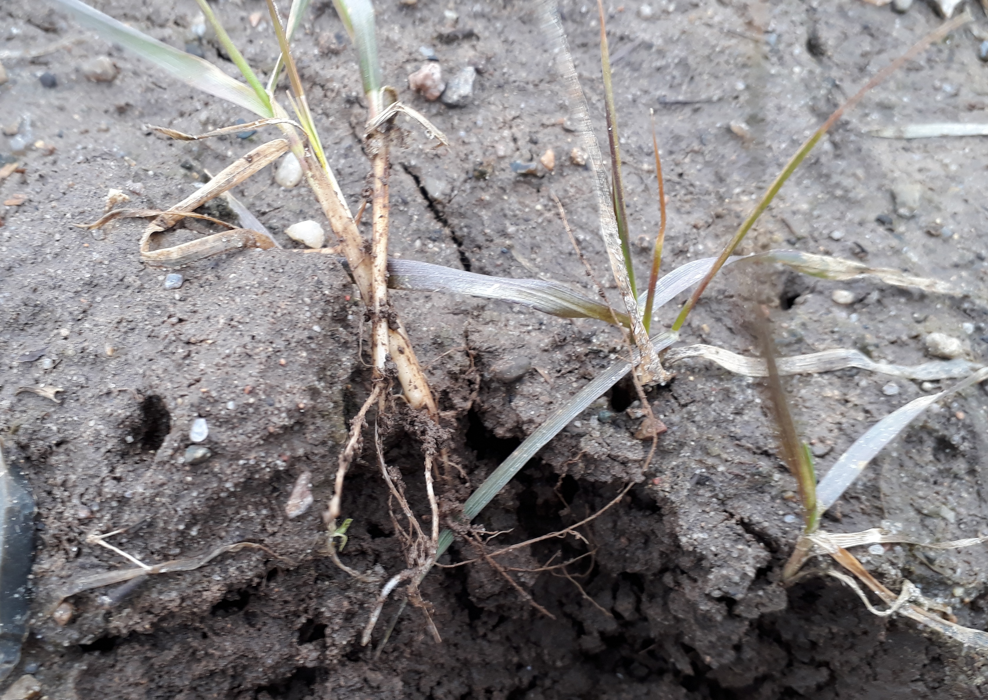Billede 1 Vinterhvede på finsandet jord. Planterne ser stressede ud med rød-lilla blade, men under jorden er der liv med friske, hvide rødder (Foto: Birgit Vestergård, SAGRO).