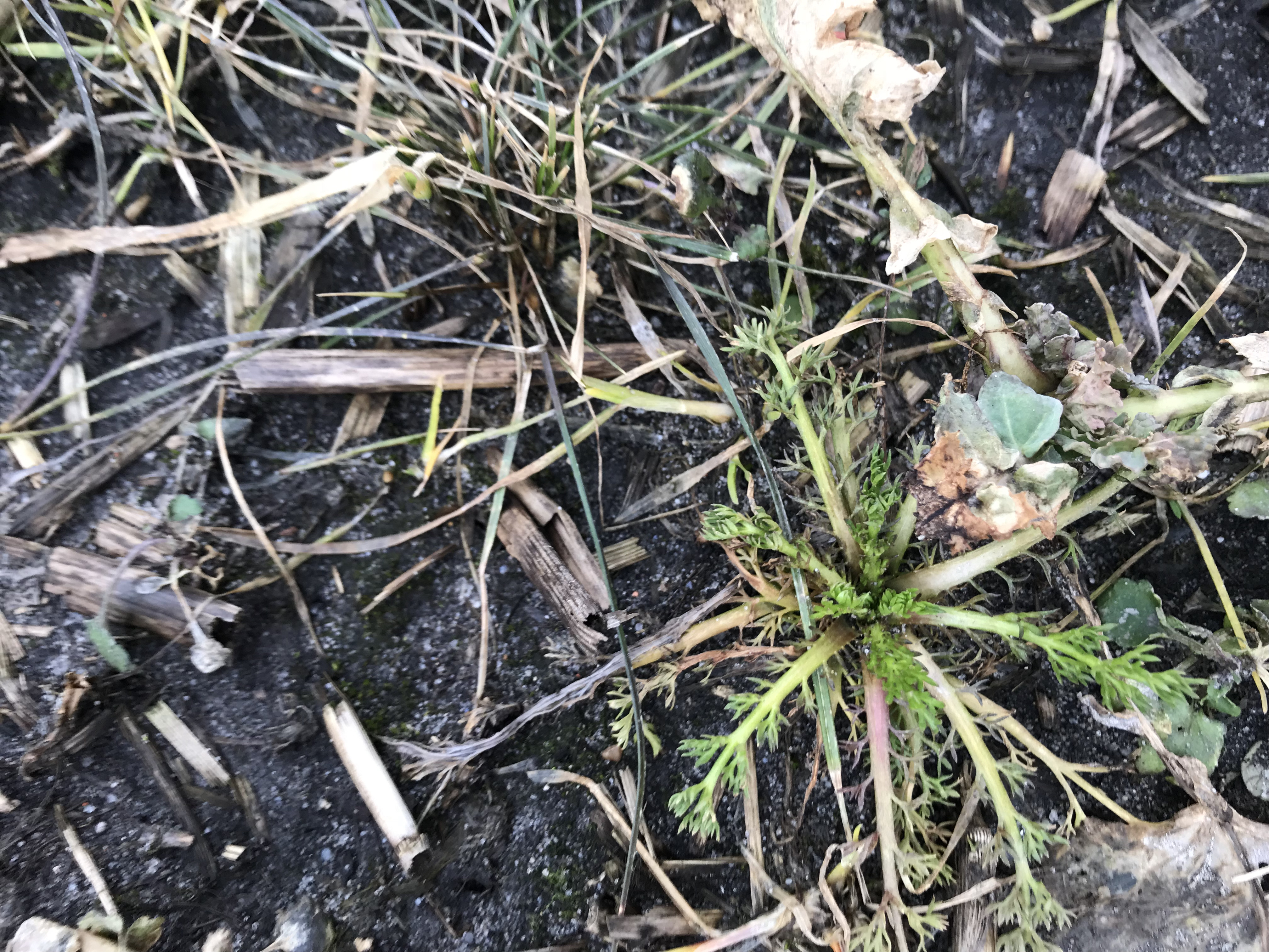 Billede 2 Kamille i rapsmark, som er sprøjtet med 0,35 l/ha Belkar i efteråret. På billedet er der frisk nyvækst. Billedet er taget den 15. marts (foto: Kasper Kjær Jensen, SAGRO).