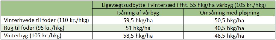 Tabel 1 Ligevægtsudbytter. Minimumsudbyttet i vintersæd, der kræves for, at det bedst kan betale sig at lade afgrøden stå. Ved lavere udbytter er det en bedre forretning at omså til vårbyg. Afgrødepriser er skrevet i parentes. Ligevægtsudbyttet er beregnet med hhv. isåning, hvor vårbyggen skal betale for såning og ekstra udsæd, samt en omsåning, hvor vårbyggen også skal betale for en pløjning.