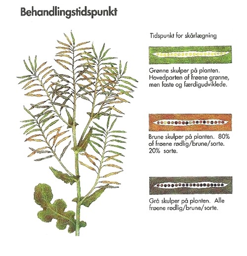 Figur 1 Det ideelle tidspunkt for skårlægning er når de fleste frø endnu grønlige i den øverste tredjedel af skulperne på top- og sideskud. I den midterste tredjedel har de fleste frø skiftet fra grønlig til rødlig farve. Og i den nederste tredjedel er frøene brunlige til sorte. (kilde: SEGES)