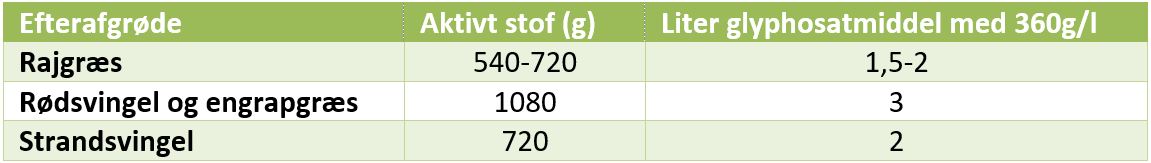 Tabel 1 Efterafgrødegræs, samt hvor mange gram glyphosat eller liter glyphosatmiddel, der skal til for nedvisning.