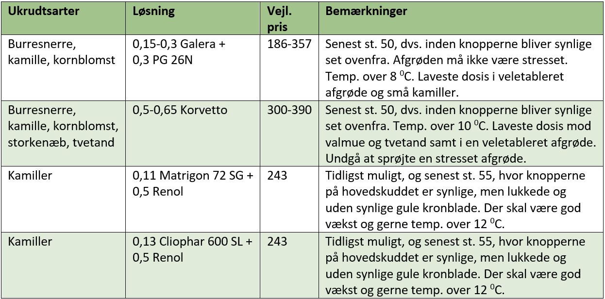 Som tommelfingerregel vil bekæmpelse i en normalt udviklet afgrøde være aktuel ved mere end 1 kamilleplante pr. m2. Der er flere muligheder for kemisk bekæmpelse. Udover Matrigon og Galera kom midlet Korvetto sidste år. Cliophar 600 SL er et parallelprodukt til Matrigon 72SG - dog med en anden koncentration af aktivstof. Se løsningsforslag i tabel 2. For at opnå god bekæmpelse af kamiller uden at skade afgrøden, er det vigtigt at tage højde for behandlingsfrister og temperaturkrav som fremgår af bemærkningsfeltet i tabellen.