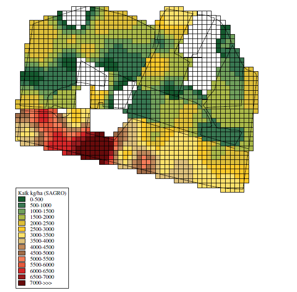 SAGRO har også stor erfaring med udtagelse af GPS-jordprøver. Prøveudtagningen udføres med moderne GPS-udstyr, og ud fra analyseresultaterne beregnes en gradueret kalktildeling. Se eksempler på markvariation i figur 2 og 3. Kalktildelingsfilerne indlæses i traktorcomputeren på kalksprederen, som herefter laver en nøjagtig tildeling af kalk.