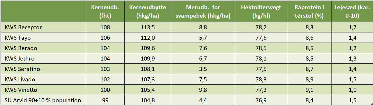 De to nye sorter KSW Receptor og KWS Tayo ligger i toppen med hhv. 113,5 og 112 hkg/ha, hvorimod det højeste råproteinindhold findes i sorten KWS Vinetto, som også har laveste tendens til lejesæd.