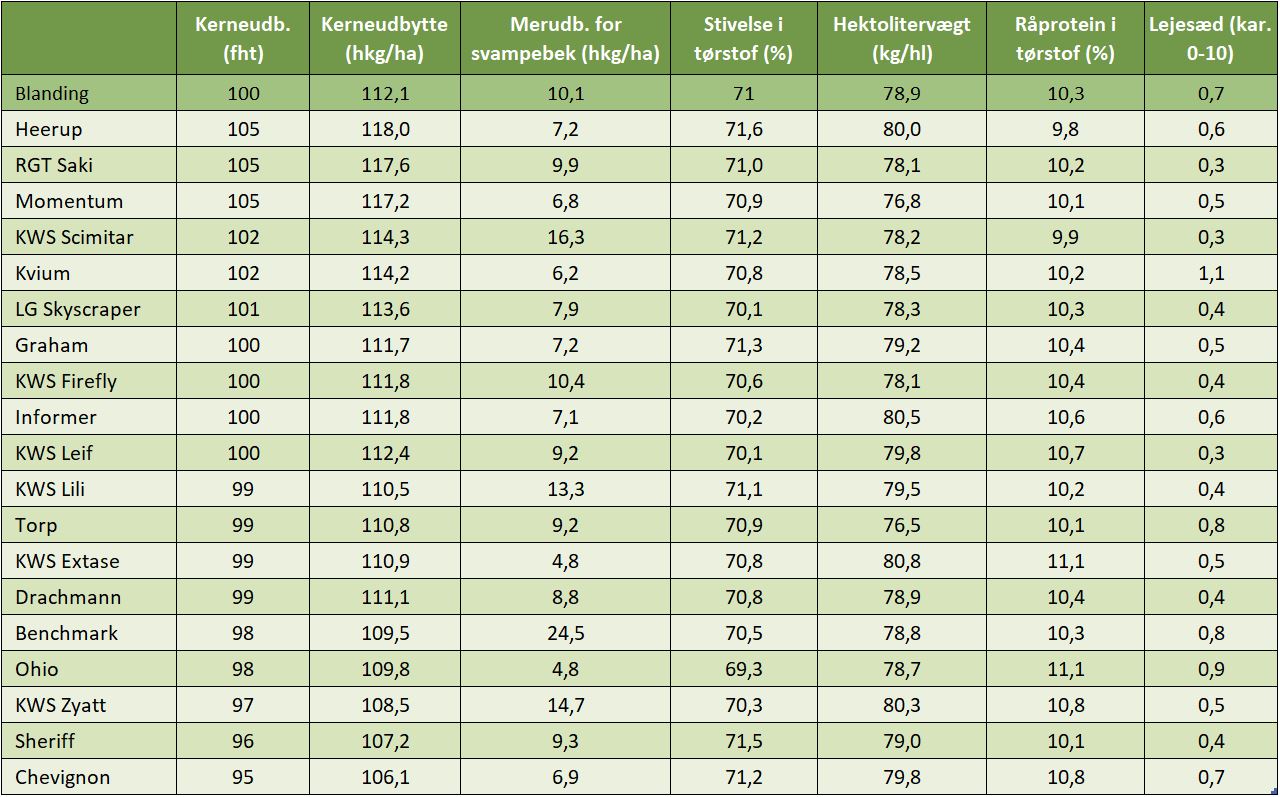 De højeste udbytter er målt i sorterne Heerup, Momentum og RGT Saki. Heerup har præsteret 118hkg/ha i gennemsnit over hele landet, den ligger også i toppen med højeste stivelsesindhold. Gamle travere som Benchmark, Sheriff, Torp, Ohio, men også nyere sorter som KWS Zyatt og Chevignon ligger i bunden med forholdstal mellem 99 og 95.