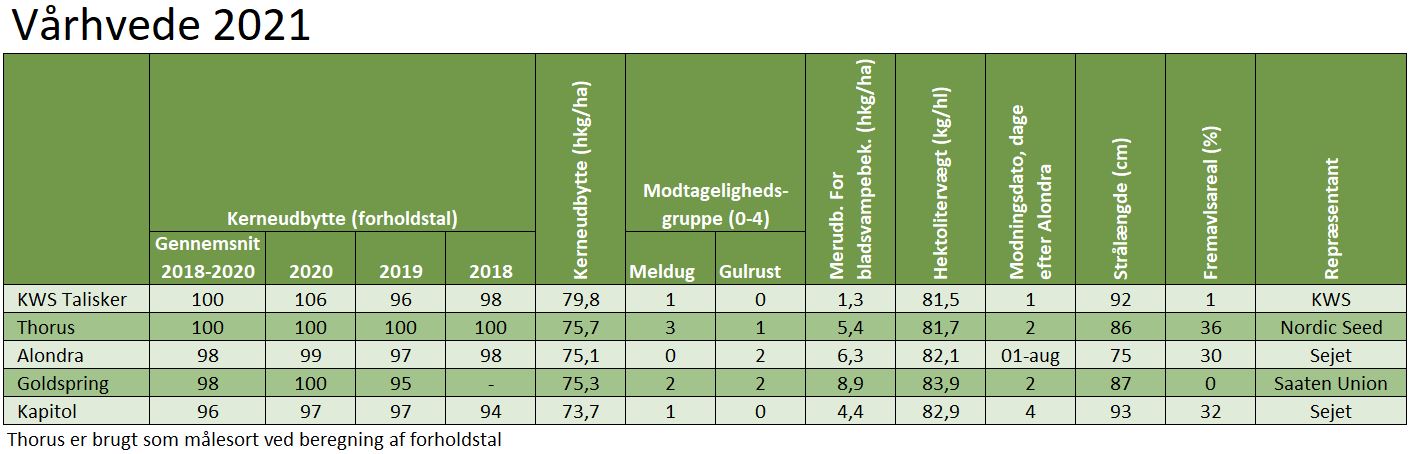 Udbyttet i vårhvede ligger i gennemsnit over årene 2018-2020 på 96-100 i de fem vårhvedesorter. Alondra skiller sig ud med lavest risiko for meldug, mens gulrust er mindst udbredt i KWS Talisker og Kapitol. Der er ingen lejesæd registreret i nogen af sorterne (data ikke i tabel).