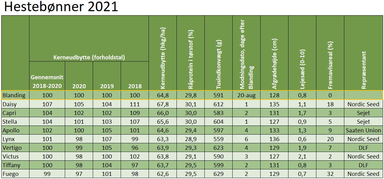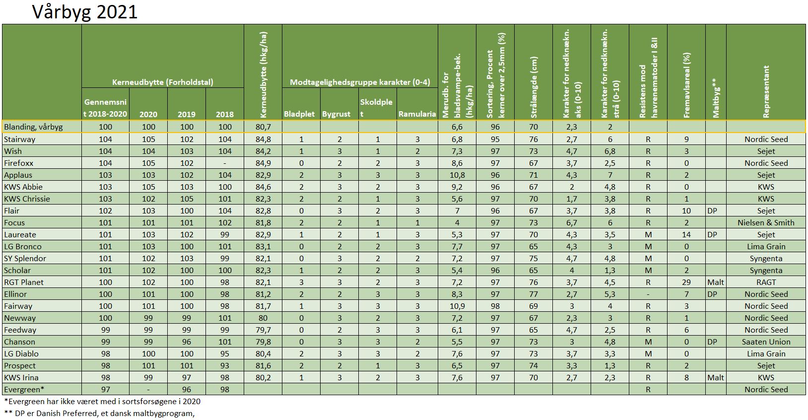 De tre sorter Daisy, Capri og Stella ligger i top med udbytteforholdstal på 104-107, og alle tre sorter har ligget stabilt med høje udbytte forholdstal de seneste år. Disse tre sorter er også dem med højest råproteinindhold på 30,0-30,1%. De største sorter er Daisy, Lynx og Fuego med størst fremavlsareal.