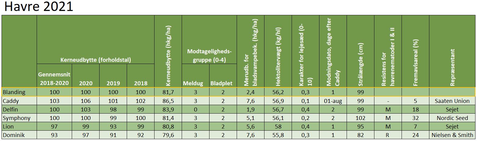 Caddy har, set over tre år, haft det bedste udbytte og har også i 2020 haft det højeste udbytte. I forhold til sygdomme er Delfin den eneste, der skiller sig ud, ved slet ikke at have meldug, hvor de andre scorer høje karakterer. Dominik er stadig den eneste sort med resistens for havrecystenematoder, til gengæld er udbyttet 10 % lavere. I marker med havreål nedbringes bestanden mest effektivt ved at dyrke en resistent vårbygsort frem for Dominik.