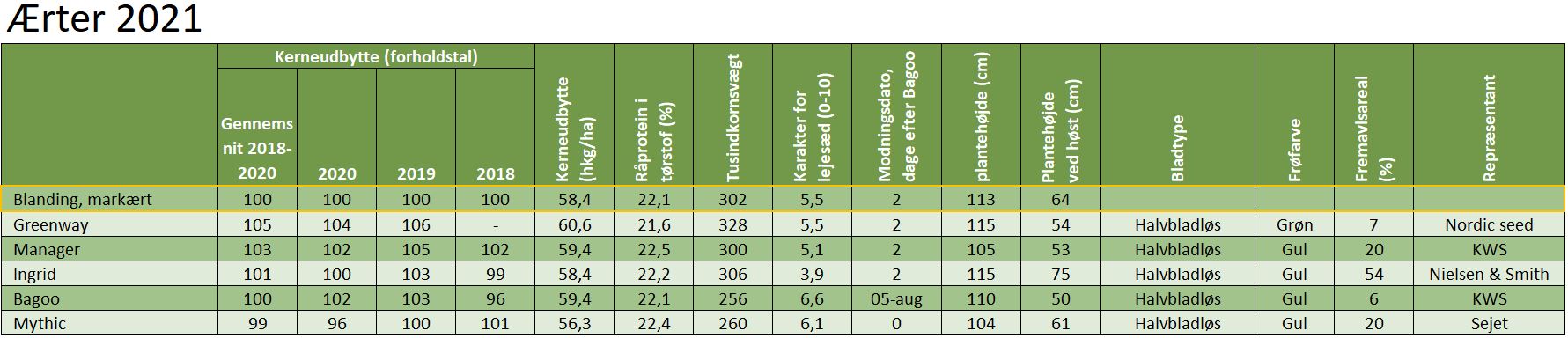 Greenway er den nyeste ærtesort på markedet, som også byder ind med det højeste gennemsnits udbytte, den har dog ikke været med i 2018. Som det fremgår af data for plantehøjde, er den mest solgt sort, Ingrid, også den der bedst holder højden til høst.