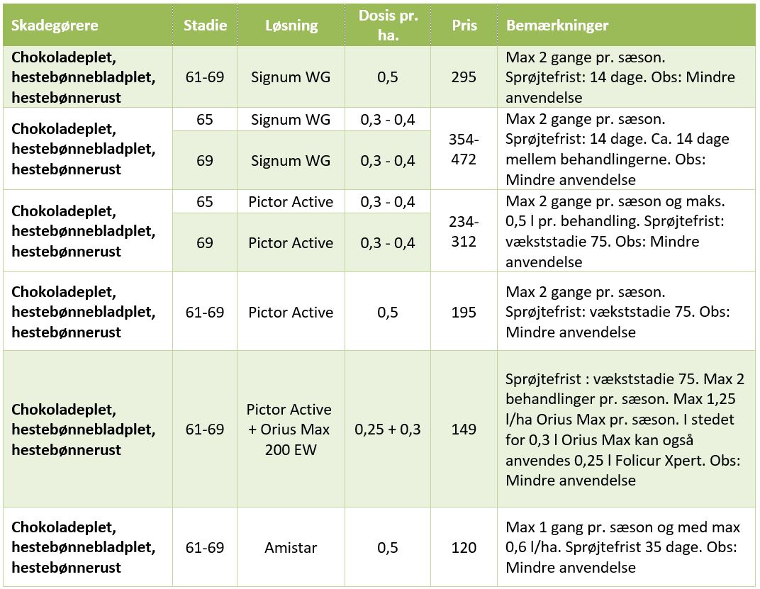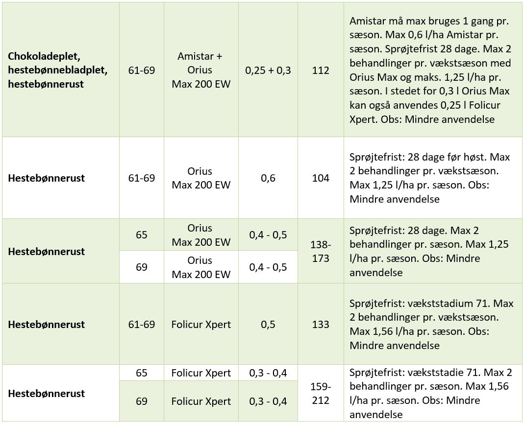 Tabel 1 Midler til svampebekæmpelse i hestebønner. Alle midler er godkendt til mindre anvendelse.