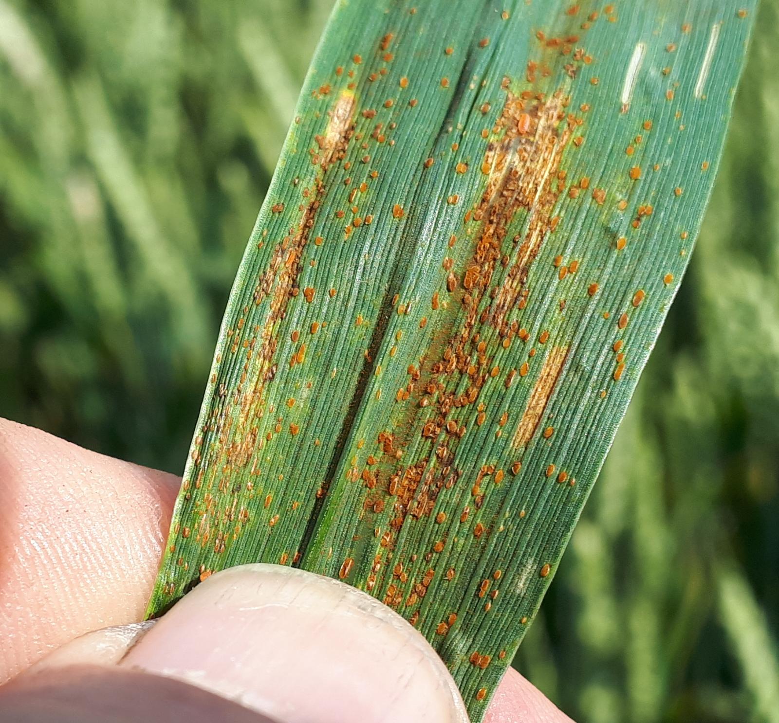 Brunrust kommer som regel sent og normalt i forbindelse med en varm periode, hvis den overhovedet dukker op. Indtil nu har vi kun set ganske lidt brunrust, men ganske få steder er der dog set lidt større angreb. Det er ved at være allersidste chance for at gøre noget, og det er kun relevant, hvis der er mange rustpustler pr blad – se billede 1, blade som disse, skal kunne findes udbredt i afgrøden, for at det er rentabelt at bekæmpe.