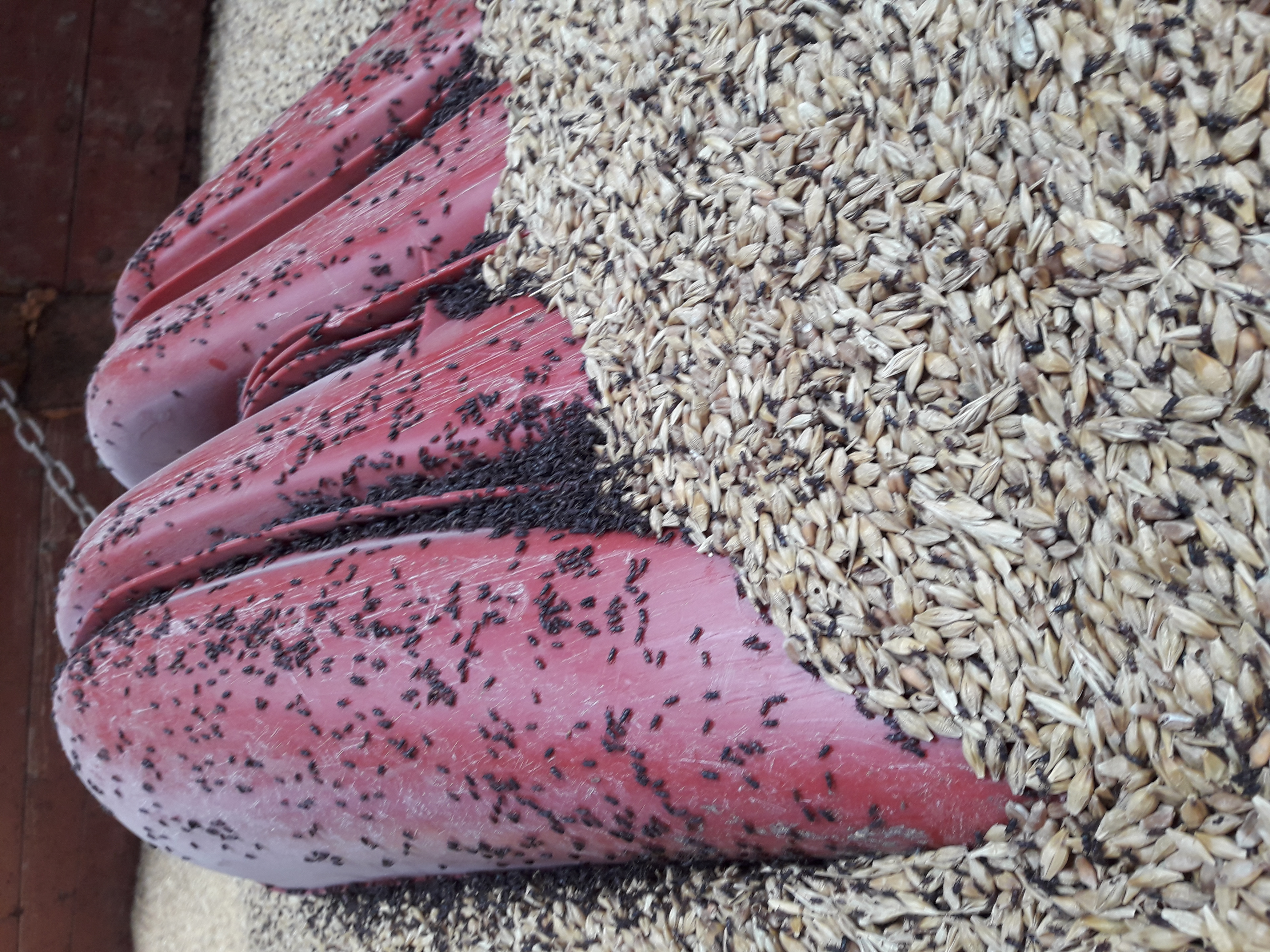 Billede 3 Kornlager med gammelt korn - og mange kornbiller. Er du i tvivl, om der er kommet skadedyr i kornet i løbet af vinteren, så fyld en plastikpose med korn fra forskellige steder i lageret og sæt den på et lunt underlag. Hvis der er skadedyr, vil de efterhånden samle sig i posens top (foto: Finn Poulsen, SAGRO).