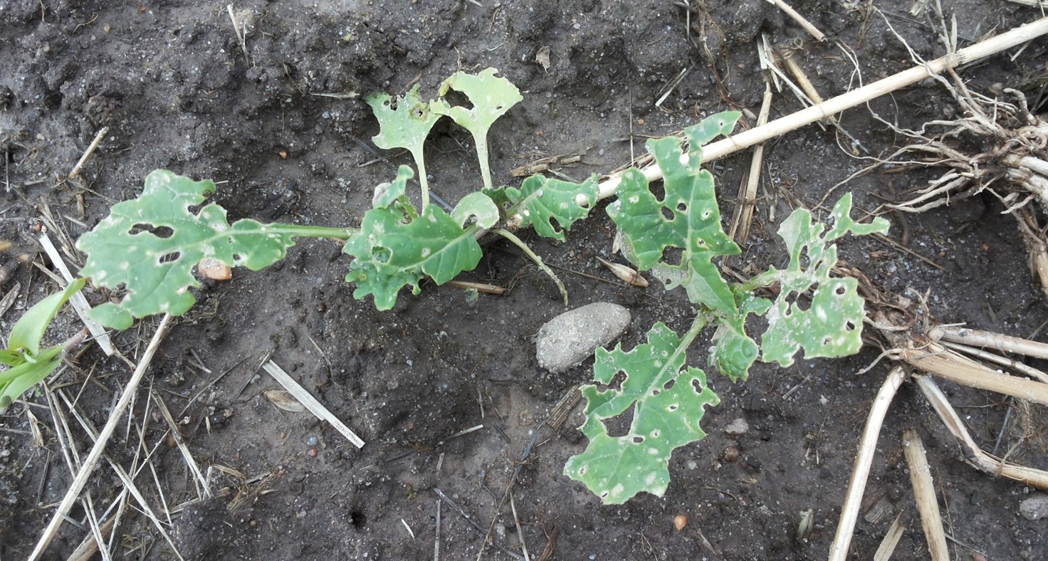 Angreb af rapsjordlopper skal tjekkes dagligt, da der ikke er noget effektivt bejdsemiddel længere. Rapsjordloppernes gnav hæmmer rapsens udvikling og kan på få dage udtynde en mark, så den står til omsåning. Da der var effektive bejdsemidler, var skadestærsklen 10 % bortgnavet bladareal frem til rapsen havde 4 løvblade. Denne tærskel er nu lavere, og derfor skal man dagligt tjekke for angreb, så der kan sættes tidligt ind med en behandling. Rapsjordlopper kan eksempelvis behandles med 0,2 l/ha Mavrik.