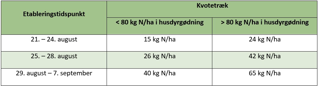 Tabel 2 Nedsættelse af kvælstofkvoten i 2021-2022 i forbindelse med udskydelse af såtidspunktet for pligtige efterafgrøder og husdyrefterafgrøder. Kvotetrækket afhænger af hvor meget husdyrgødning, der er tildelt på bedriften i 2019/2020. Tallene for kvotereduktionen er rettet, da de er blevet sænket en anelse i år.