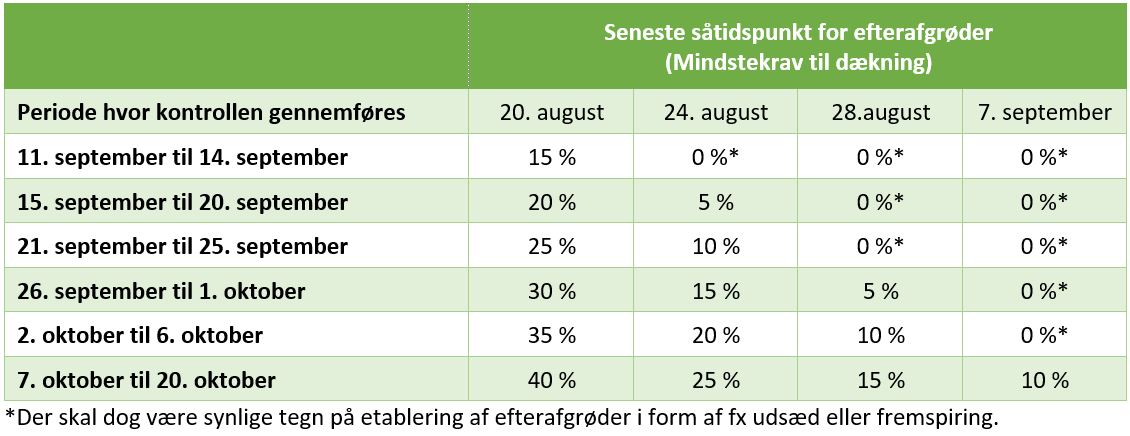 Vær opmærksom på, at i de tilfælde, hvor der står at kravet er 0 % dækning i tabel 1, skal der være synlige tegn på etableringen af efterafgrøder, fx i form af udsæd eller fremspiring.