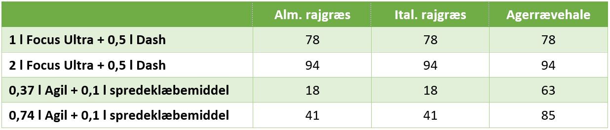 Tabel 1 Effekt af Focus Ultra og Agil på rajgræs og agerrævehale med 5-6 blade.
