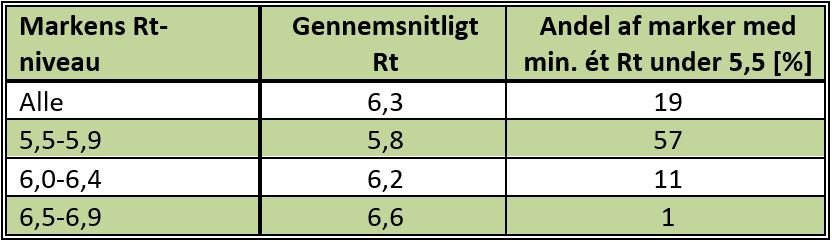 Tabel 3 Markens Rt-niveau, gennemsnitligt Rt og andel af enkeltprøver under 5,5