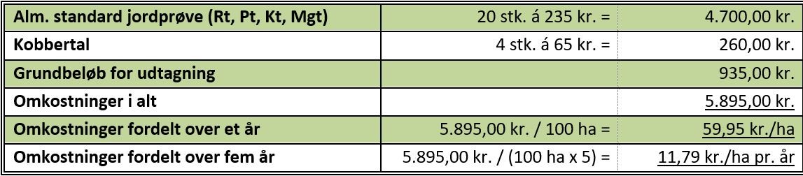 I løbet af efteråret og vinterperioden har du mulighed for at udtage jordprøver og ligeledes få kalket dine arealer, inden næste års afgrøde skal sås. Selvom jordprøveudtagning på hele arealet kan mærkes som en stor engangsudskrivning, bør du i stedet se omkostningen i lyset øvrige gødningsmidler, som du alligevel indkøber i løbet af en sæson. I tabel 2 er omkostningerne i forbindelse med udtagning af jordprøver opgjort for en ejendom på 100 ha.
