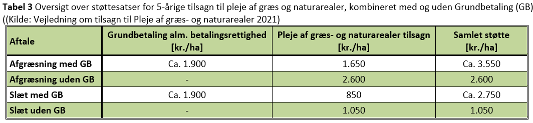 For at kunne få tilsagn til arealerne er der flere krav, der skal være opfyldt. Bl.a. skal arealerne have en tilstrækkelig høj naturværdi (HNV på minimum 5). Arealerne skal plejes med afgræsning eller slæt, som kan kombineres med eller uden grundbetaling. Tilskudssatsen afhænger af om tilsagnet kombineres med grundbetaling. Tilskudssatserne ses i nedenstående tabel. Har du et 20-årigt tilsagn til Miljøvenlige jordbrugsforanstaltninger (MVJ-ordninger), som udløber i 2021, og som du fortsat ønsker at have tilsagn på, så kan de formentlig kun erstattes af de 5-årige tilsagn til pleje af græs- og naturarealer.
