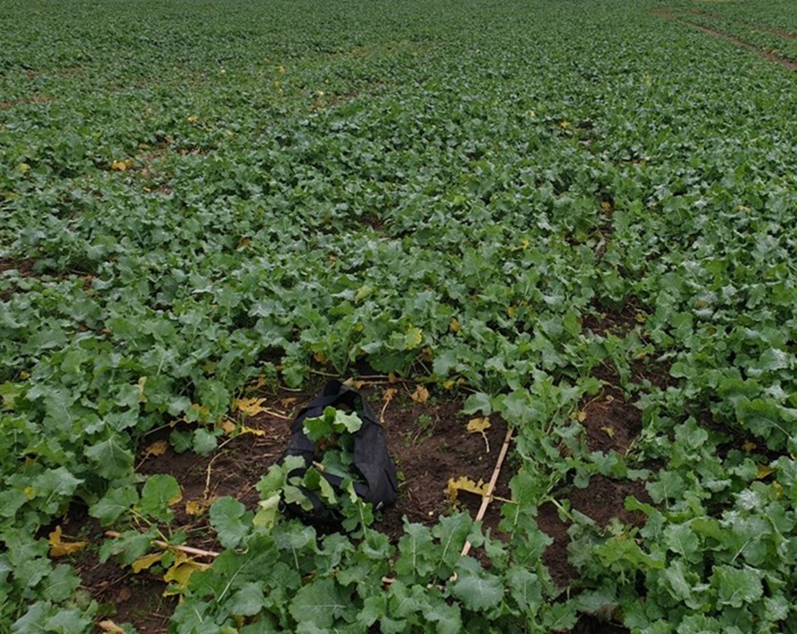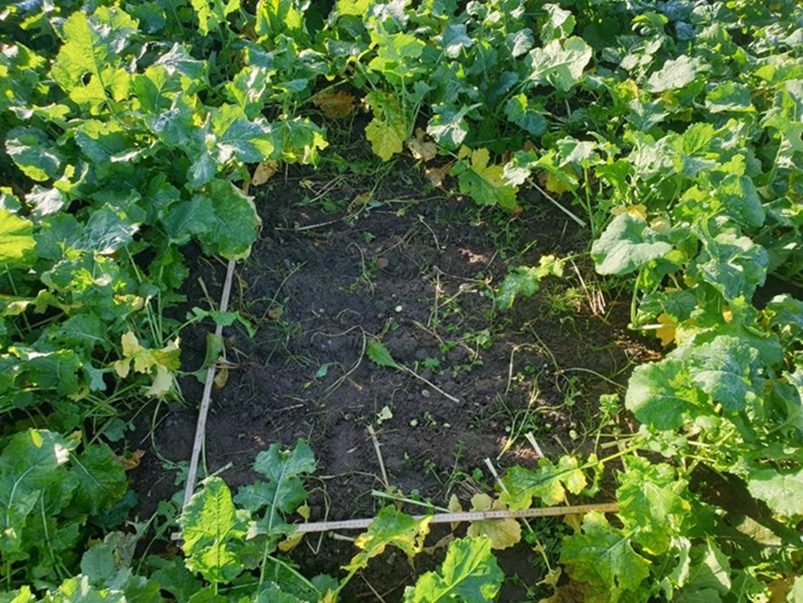 Princippet er simpelt. Man klipper planterne af ved jordoverfladen i en kvadratmeter og vejer biomassen. Gør det gerne 3-4 steder i marken, og brug gennemsnittet. Hvis planterne er våde, så sørg for at ryste dem godt inden vejningen. Brug en vægt der er præcis og med lille usikkerhed. Vejningen skal laves inden rapsens blade klasker sammen pga. frost.