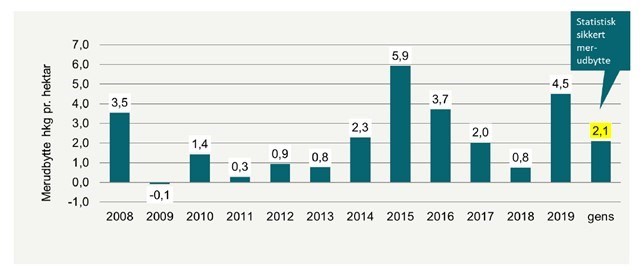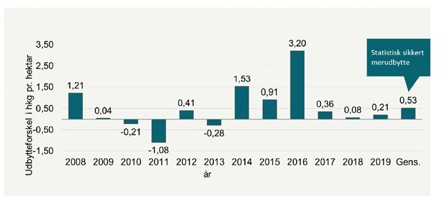 SEGES har sammenlignet resultater fra forsøg i årene 2008-2019, hvor sortsblandingen, der altid indgår i Landsforsøgenes sortsforsøg, er sammenlignet med de mest 4 mest dyrkede sorter hvert enkelt år. Sortsblandingen bliver løbende opdateret, sådan at den er en blanding af fire gode sorter.