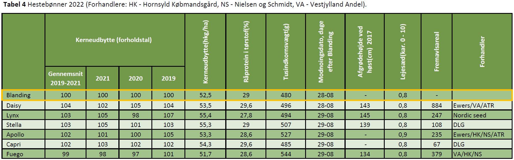 Tabel 4 Hestebønner 2022. (Forhandlere: HK - Hornsyld Købmandsgård, NS - Nielsen og Schmidt)