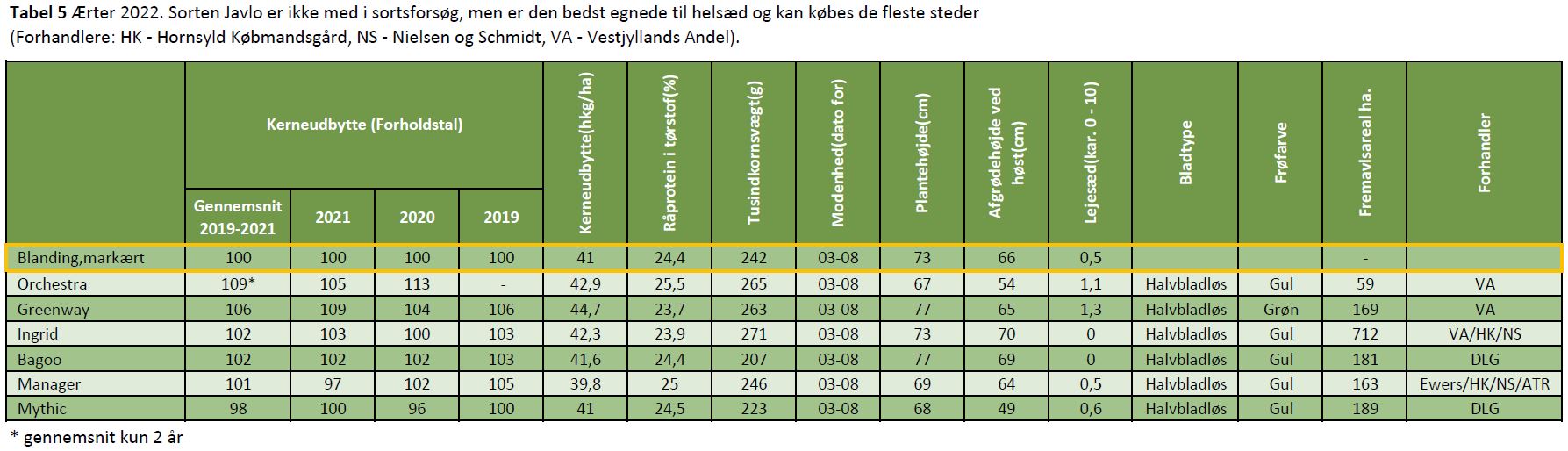 Tabel 5 Ærter 2022. Sorten Javlo er ikke med i sortsforsøg, men er den bedst egnede til helsæd og kan købes de fleste steder. (Forhandlere: HK - Hornsyld Købmandsgård, NS - Nielsen og Schmidt)