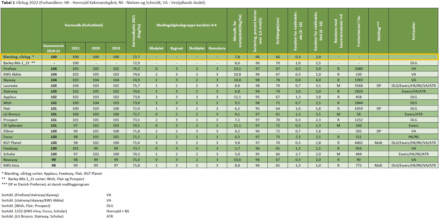 Tabel 1 Vårbyg 2022. (Forhandlere: HK - Hornsyld Købmandsgård, NS - Nielsen og Schmidt)